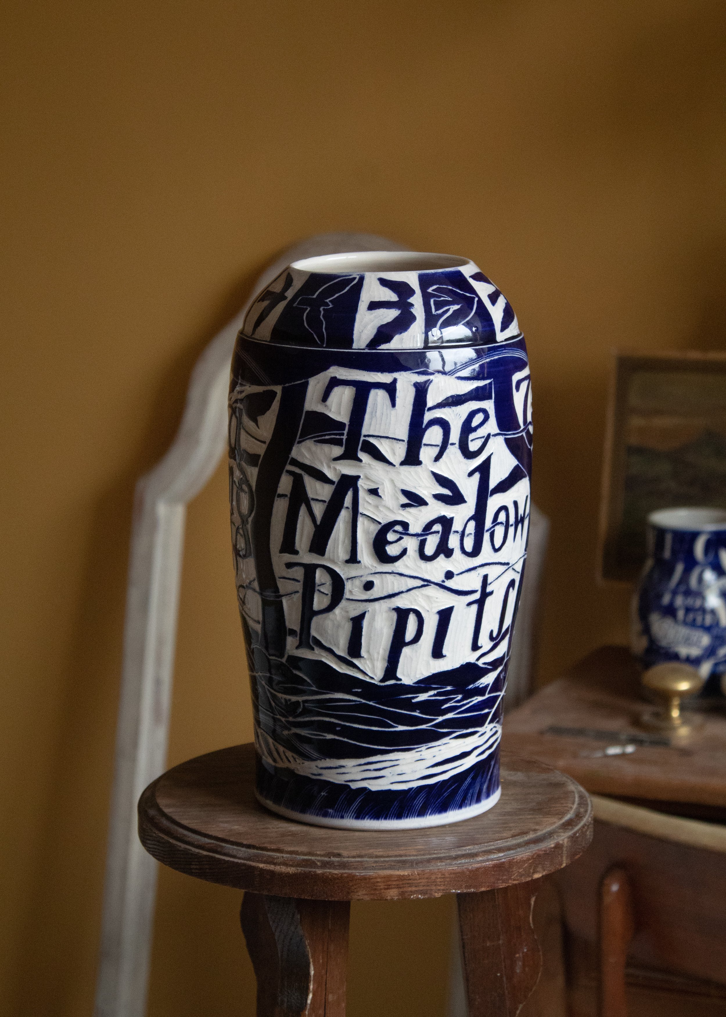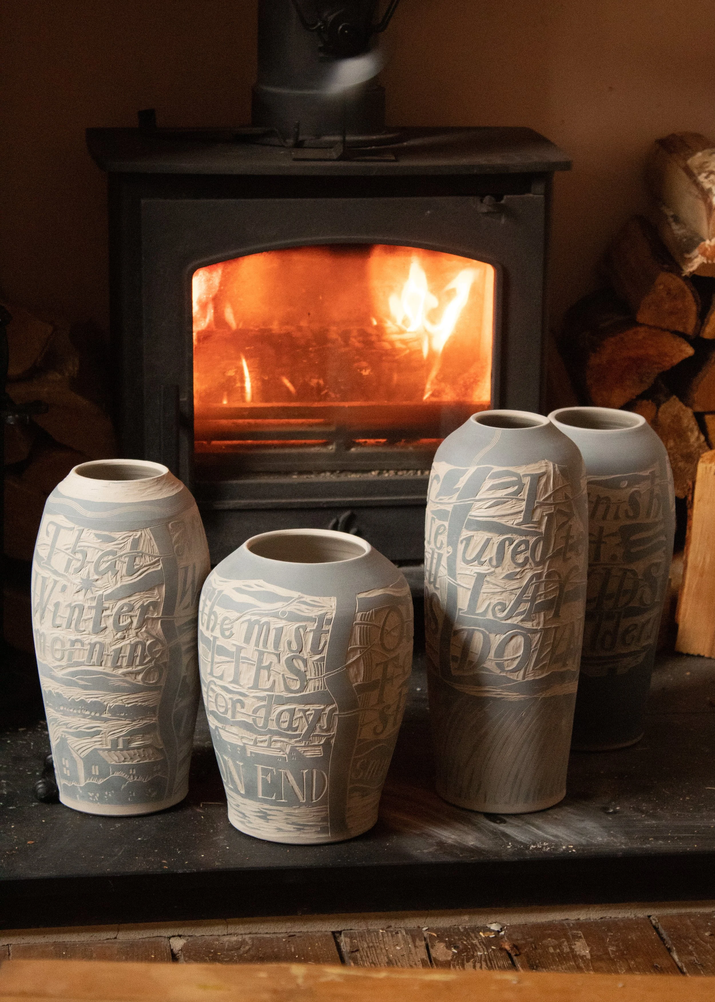 Benjamin Hall – otherwise known as Mr Ben – is a ceramicist, painter and songwriter living in Sheffield. After honing his craft in an old barn next to his childhood home the unmistakable imprint of the fells and valleys of his native Westmorland became indelibly furrowed into clay, canvas and song. Today Hall runs a thriving pottery studio affectionately known as ‘The Melody Shed’ alongside writing, releasing albums and touring the UK with his band. Hall’s visual work ranges from humble tableware to beguiling illustrative vases, jars and oil paintings. Traditional ‘Sgrafitto’ is at the heart of the ceramic decoration, with handmade tools carving intricate landscapes and poetry written by Ben into a variety of slipped vessels. Hall’s love of regional dialect and knack for a lyrical turn of phrase comes to life through the tactile engraving process, merging his physical work with the literary.