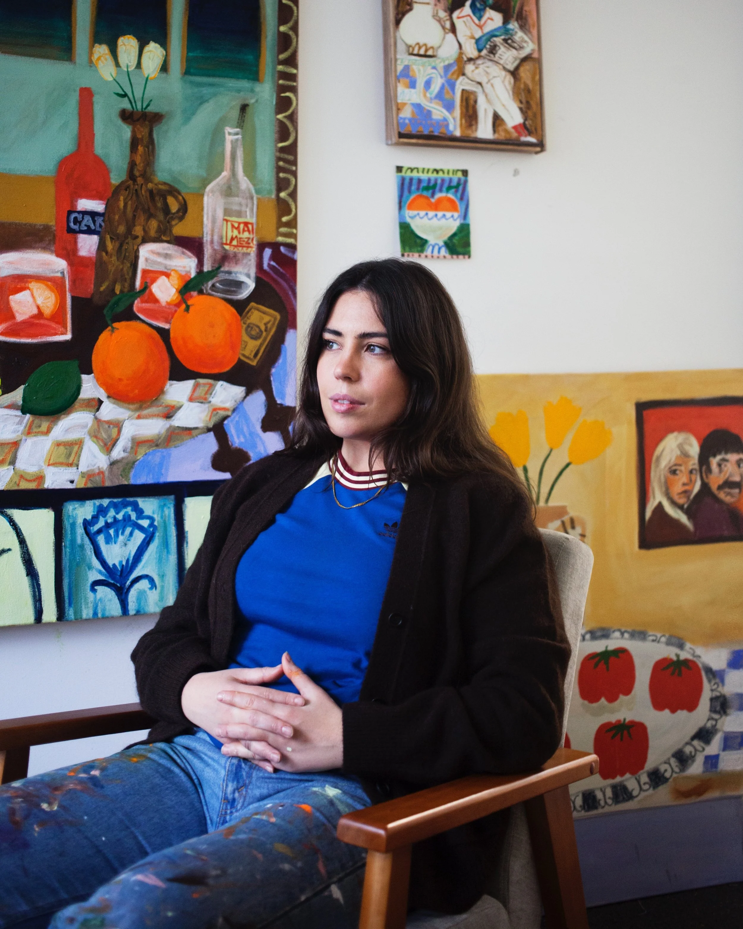 Frankie’s works are made up of playful compositions with references to both past and present, occasionally tapping into conversations around ‘Britishness’. Her larger works are focused around messy tablescapes dotted with food and drink and often accompanied by pensive looking figures and sleeping dogs.