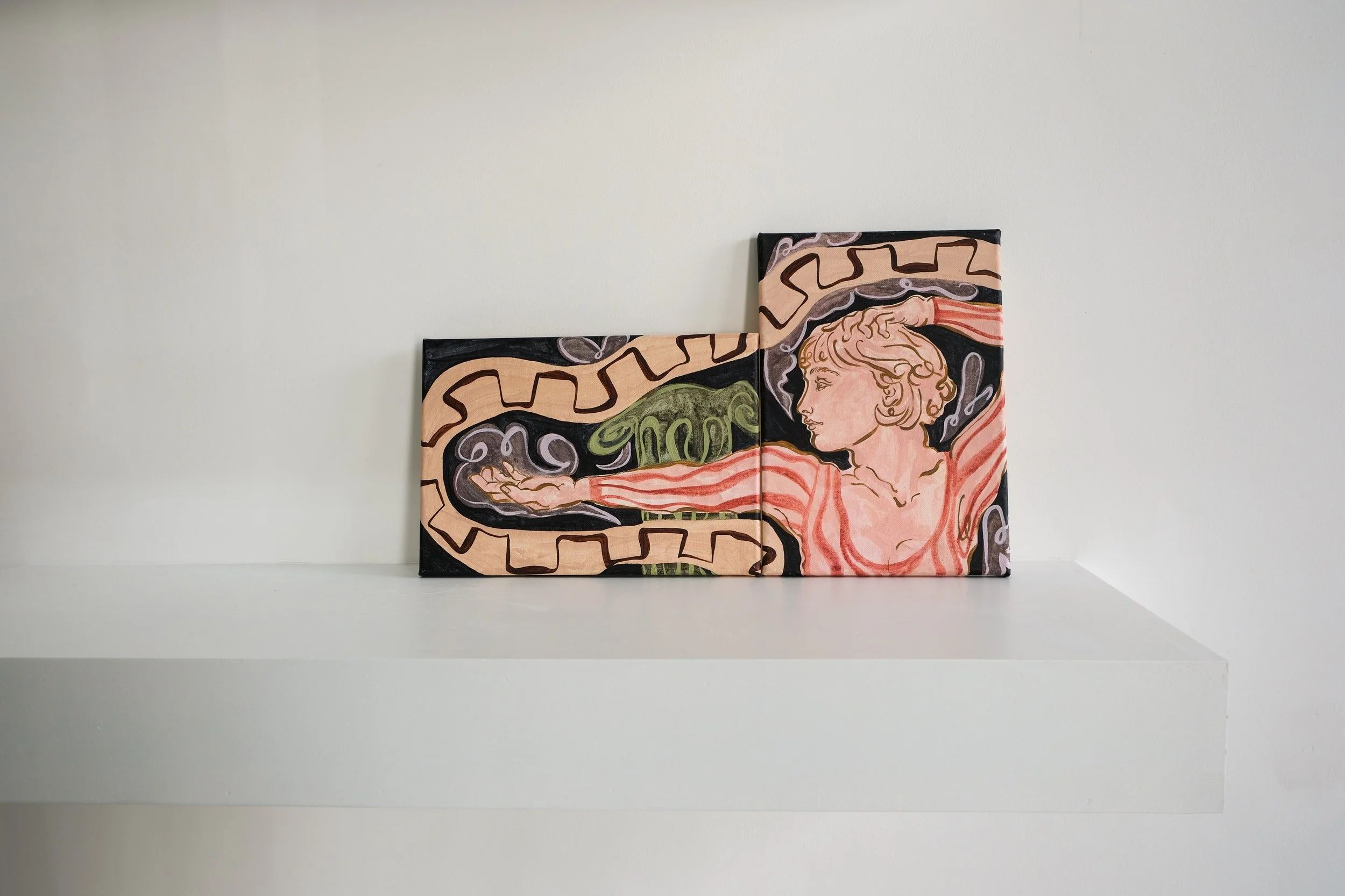 Ruby Bateman is a visual artist working from her home studio in the South West Countryside. Using a richly colourful and symbolic visual language, Ruby interweaves classical, gothic and esoteric elements into the creation of her paintings and drawings. Lately, existentialism is an enduring inquiry for Ruby. She often tells stories about the human experience of love and loss, institutionalised motherhood and dualism; the ego's (dis)association with nature. Through origin-fiction writing, paint and ink, Ruby is able to transform these questions into allegorical images, connecting her heart to a deeper material consciousness.