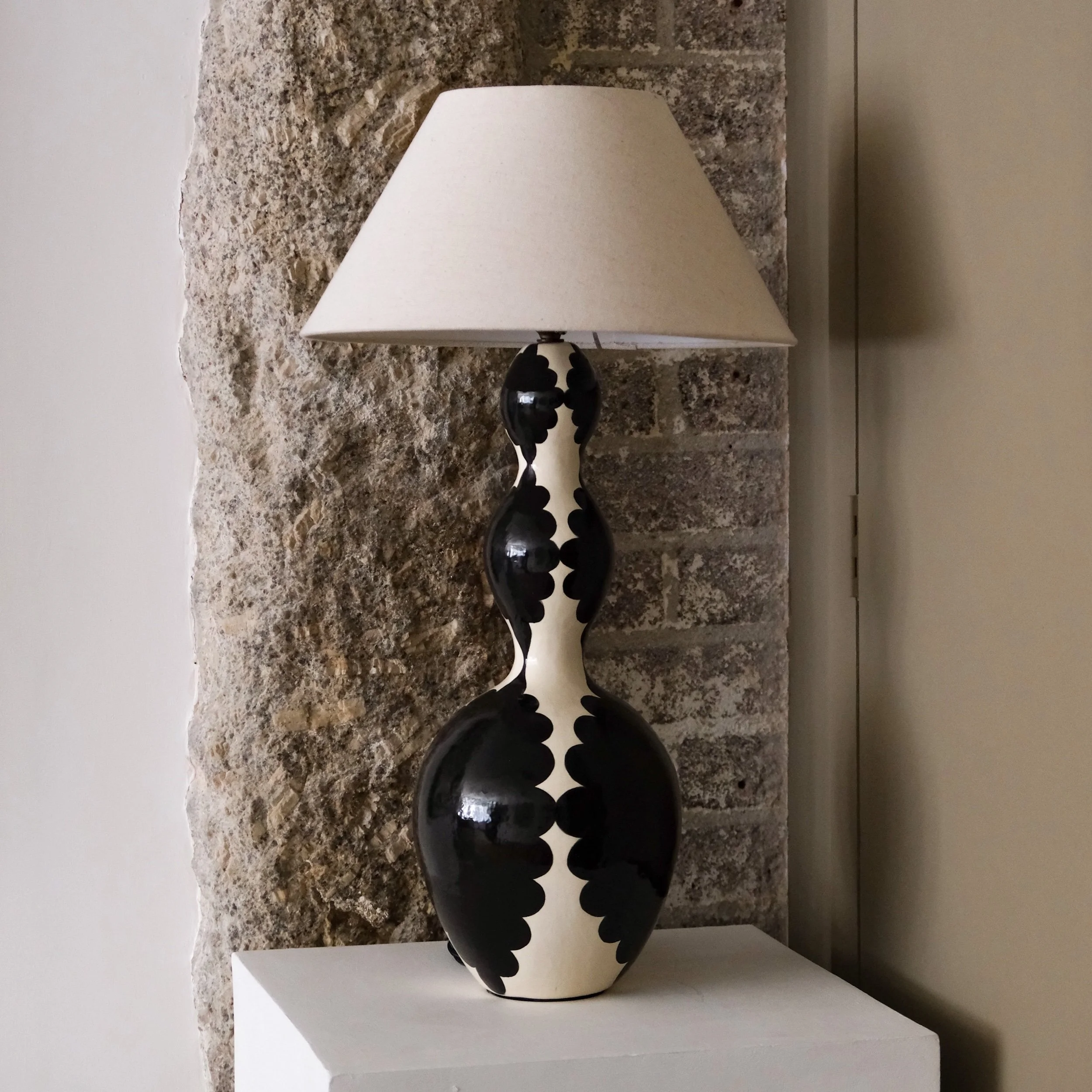 Coil built earthenware lamp, hand painted in high gloss monochrome palette