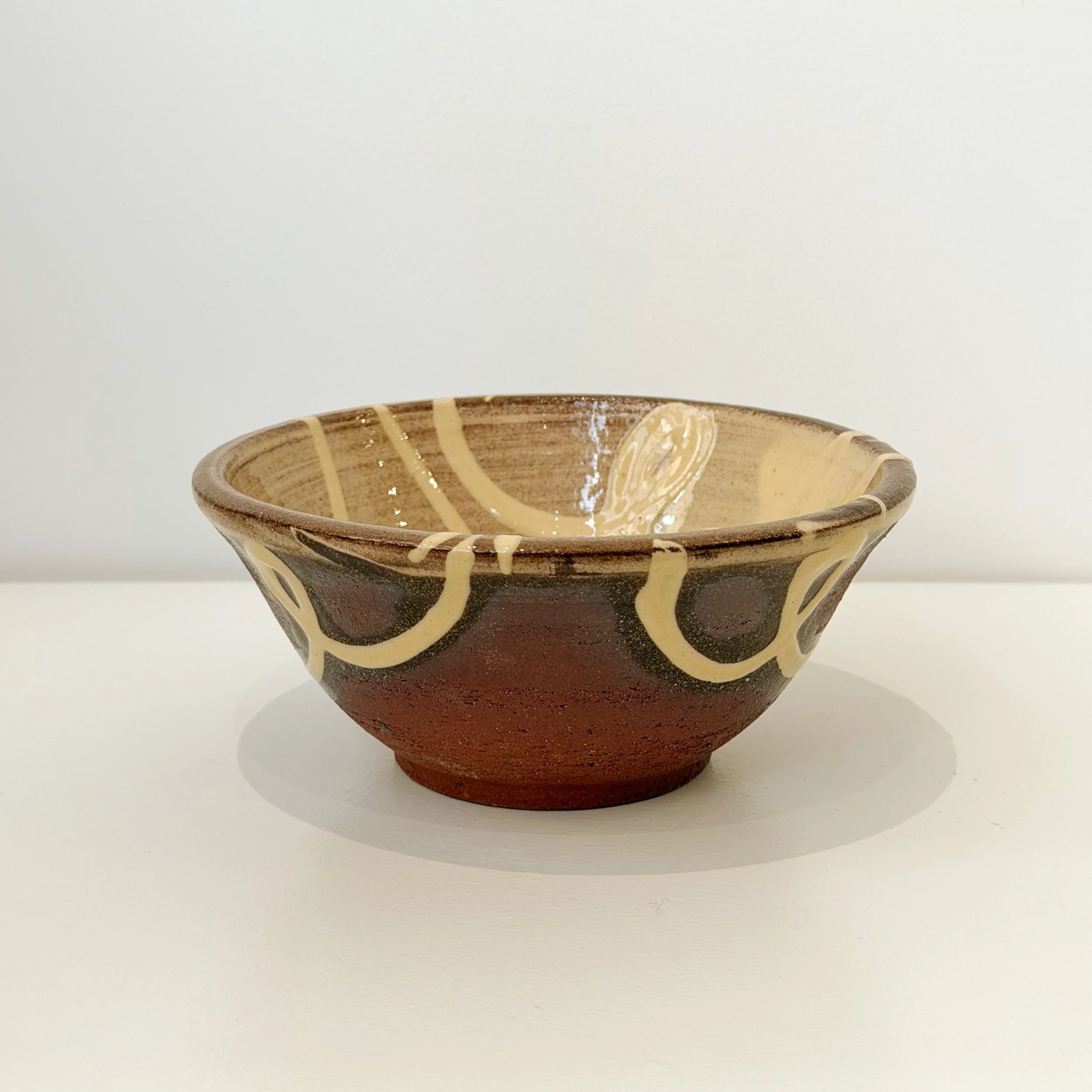 Slip decorated terracotta serving bowl with squiggle decoration in cream.